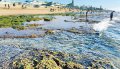 திருச்செந்தூா் சுப்பிரமணிய சுவாமி கோயில் அருகே சுமார் 500 மீட்டர் நீளத்திற்கு கடல் உள்வாங்கியதால் பாசி படா்ந்த பாறைகள் தெரிந்தன.