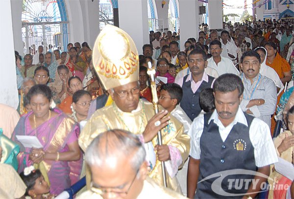உலக பிரசித்திப்பெற்ற, கிறிஸ்தவ தேவாலயங்களில் மிகவும் பழமை வாய்ந்த பேராலயமான தூத்துக்குடி தூய பனிமய மாதா பேராலயத்தின் திருவிழா இன்று கொடியேற்றத்துடன் துவங்கியது. இன்று காலை 6.30 மணிக்கு, திருப்பலியும், 7.30 மணிக்கு ஆயர் இவோன் அம்புரோஸ் தலைமையில் கூட்டுத்திருப்பலியும் நடைபெற்றது. பின்னர் 9.03 மணிக்கு திருவிழாவின் முக்கிய நிகழ்ச்சியான கொடியேற்று விழா நடைபெற்றது. இதில் சுமார் 50 ஆயிரத்திற்கும் மேற்பட்ட பக்தர்கள் கலந்து கொண்டு வழிபட்டனர். இதனைத் தொடர்ந்து உலக சமாதானத்தை வலியுறுத்தி வெள்ளை நிற புறாக்கள் பறக்கவிடப்பட்டன. (படங்கள்:இருதயராஜ்)