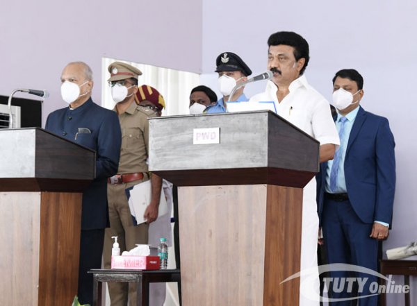 தமிழக முதல்வராக திமுக தலைவர் மு.க.ஸ்டாலின் "முத்துவேல் கருணாநிதி ஸ்டாலின் எனும் நான்.." எனத் தொடங்கி பதவியேற்றுக் கொண்டார்.