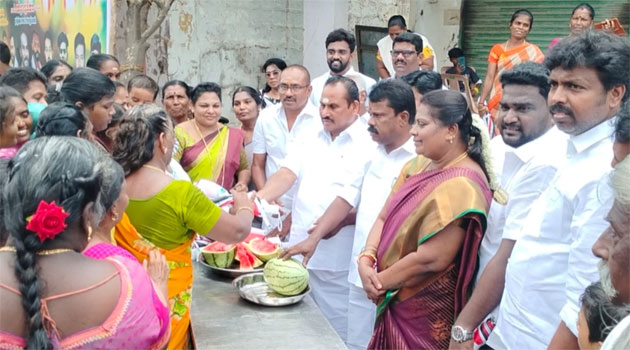 தூத்துக்குடி தெற்கு மாவட்ட மகளிர் அணி துணைச் செயலாளர் ஆர்.ராதா தலைமையில் வி.ஜி.எஸ் பள்ளி முன்பு பக்தர்களுக்கு தர்பூசணி, சர்பத் மற்றும் குடை உள்ளிட்டவைகளை முன்னாள் அமைச்சர் எஸ்.பி. சண்முகநாதன் வழங்கினார்.