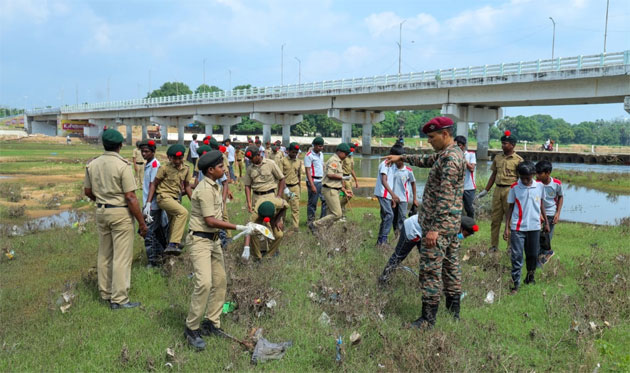 ஏரல் ஆற்றங்கரையில் ஸ்ரீ கணேசர் பள்ளி என்.சி.சி., மாணவர்கள் தூய்மைப்பணி