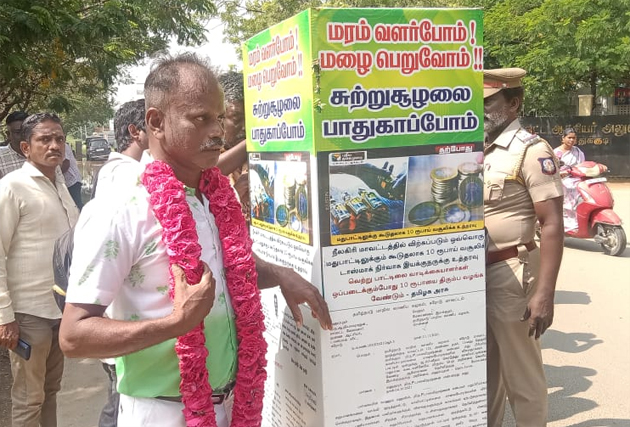 தமிழகத்தில் டாஸ்மாக் கடைகளில் காலி மது பாட்டில்களை திரும்பப் பெறும் திட்டம் தற்போது அமலில் உள்ளது, இதில் பாட்டிலுக்கு ரூ.10 வழங்கப்படும். இந்த நிலையில், தூத்துக்குடி அண்ணா நகர் 11வது தெருவைச் சேர்ந்தவர் பாலகிருஷ்ணன் (50), சமூக மற்றும் சுற்றுச்சூழல் ஆர்வலர். இவர் அரசு அறிவித்துள்ள காலி மது பாட்டில்களை திரும்ப பெறும் உத்தரவு தனக்கு கிடைத்த வெற்றி என்று கூறி, அரசுக்கு நன்றி தெரிவிப்பதற்காக கழுத்தில் ரோஜாப்பூ மாலை அணிந்து கொண்டு, ரதம் போன்ற வாகனத்துடன் தூத்துக்குடி மாவட்ட ஆட்சியர் அலுவலகத்திற்கு வந்தார்.