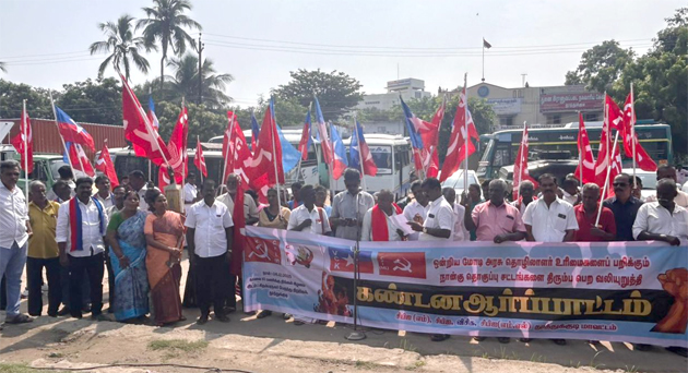 தொழிலாளர் உரிமைகளைப் பறிப்பதாகக் கூறி, மத்திய அரசு கொண்டு வந்த நான்கு புதிய தொழிலாளர் சட்டங்களை திரும்பப் பெற வலியுறுத்தி தூத்துக்குடியில் சிதம்பரநகர் பேருந்து நிறுத்தம் அருகே சிபிஐ(எம்), சிபிஐ, விசிக, சிபிஐ(எம்.எல்) கட்சிகளின் சார்பில் கண்டன ஆர்ப்பாட்டம் நடைபெற்றது.