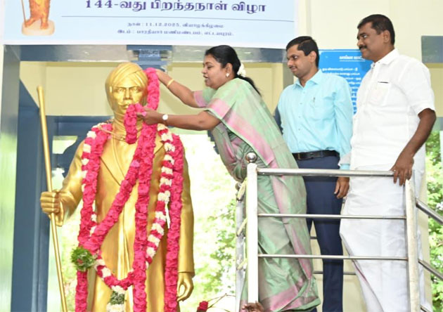 மகாகவி பாரதியாரின் 144-வது பிறந்த நாளை முன்னிட்டு தமிழ்நாடு அரசு சார்பில் அமைச்சர் பி.கீதா ஜீவன் மரியாதை செலுத்தினார்.