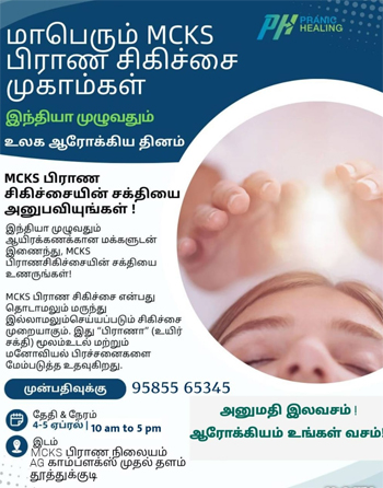தூத்துக்குடியில் உடல் மற்றும் மன ரீதியான பிரச்சனைகளுக்குத் தீர்வு காணும் வகையில், மருந்து, மாத்திரைகள் இல்லாத 'MCKS பிராண சிகிச்சை' சிறப்பு முகாம் வருகிற 4 மற்றும் 5ஆம் தேதி நடைபெற உள்ளது.இதுகுறித்து பிராண நிலையம் வெளியிட்டுள்ள அறிக்கையில், "MCKS பிராண சிகிச்சை என்பது நோயாளியைத் தொடாமலும், மருந்து மாத்திரைகள் இல்லாமலும் செய்யப்படும் ஒரு நவீன சிகிச்சை முறையாகும். பிராணா' எனப்படும் உயிர்ச்சக்தியைப் பயன்படுத்தி, உடல் உபாதைகள் மற்றும் மனோவியல் ரீதியான சிக்கல்களைச் சீரமைக்க இச்சிகிச்சை பெரிதும் உதவுகிறது.
