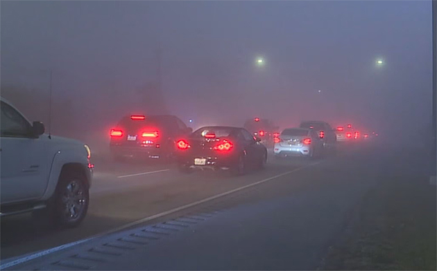 அங்கு அமைந்திருந்த சாலையில் முன்னால் செல்லும் வாகனங்களை பார்க்க முடியாத அளவுக்கு பனிமூட்டம் அடித்தது. மேலும் போக்குவரத்து சிக்னல்களில் எரியும் விளக்குகளை காண முடியாததால் வாகனங்கள் நகர முடியாமல் திணறின.