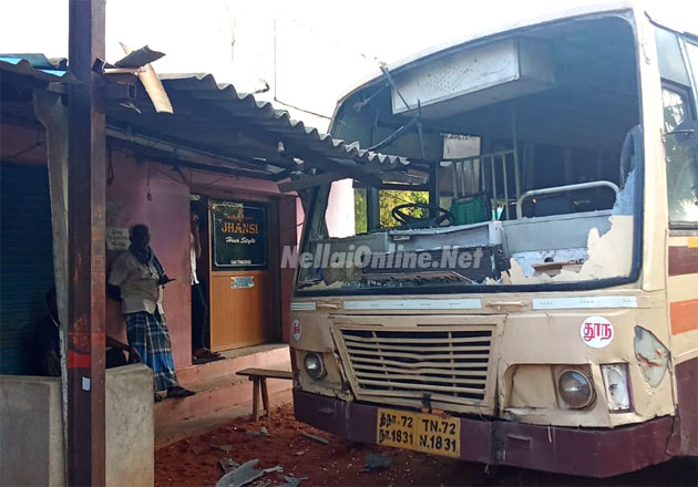 பெருங்குளத்திலிருந்து தூத்துக்குடி செல்லும் அரசு பேருந்து இன்று மாலை 4.30 மணிக்கு சேர்வைக்காரன்மடம் ஊராட்சி தங்கம்மாள்புரம் பகுதியில் சென்று கொண்டிருந்தபோது, திடீரென கட்டுப்பாட்டை இழந்து அருகிலுள்ள மளிகை கடை மீது மோதியது. இதில் பேருந்தின் முன்பக்க கண்ணாடி உடைந்து சேதம் அடைந்தது.