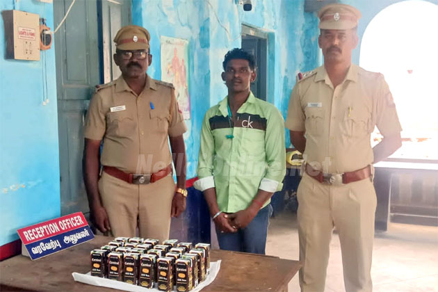 விசாரணையில் அவர் சேர்வைக்காரனமடம், மேலத் தெருவைச் சேர்ந்த வெள்ளையா மகன் முத்துக்குமார் (28) என்பதும் பெங்களூரில் இருந்து மதுபாட்டில்களை கடத்தி வந்ததும் தெரியவந்தது. இதையடுத்து போலீசார் அவரை கைது செய்து அவரிடம் இருந்த 24 மது பாட்டில்களையும் பறிமுதல் செய்தனர். இந்த சம்பவம் ரயில் நிலையத்தில் பயணிகள் மத்தியில் பரபரப்பை ஏற்படுத்தியது.