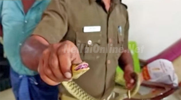 தூத்துக்குடி முத்தையாபுரம் தேவி நகரில் வசிப்பவர் சத்திய நாராயணன். வ.உ.சிதம்பரனார் துறைமுகத்தில் பணிபுரிந்து வருகிறார். மேலும் துறைமுக சபை உறுப்பினராக உள்ளார். நேற்று முன்தினம் இவர் தனது குடும்பத்துடன் வீட்டில் படுத்து தூங்கிக் கொண்டிருந்த போது உஷ் உஷ் என்று சத்தம் கேட்டுள்ளது. இதையடுத்து சத்யநாராயணன் வீட்டுக்குள் பார்த்தபோது டைனிங் ஹால் அறையில் ஒரு பாம்பு பதுங்கி இருப்பது தெரியவந்தது. தூத்துக்குடி துறைமுக தீயணைப்பு அலுவலகத்திற்கு தகவல் தெரிவித்தார்