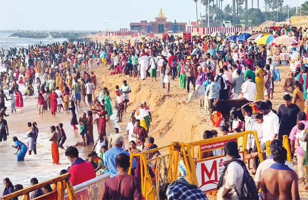 இதனால் பக்தர்கள் கரையில் இருந்து கடலில் இறங்குவதற்கு சிரமப்பட்டனர். முன்னெச்சரிக்கையாக இப்பகுதியில் கோயில் நிா்வாகம் சாா்பில் தடுப்புகள் வைக்கப்பட்டுள்ளன. பக்தா்கள் பாதுகாப்புடன் குளிக்குமாறு போலீசார், கடற்கரை பாதுகாப்பு பணியாளா்கள் அறிவுறுத்தினா்.