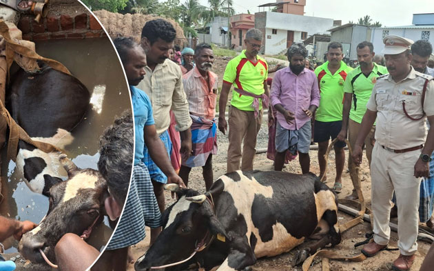 பொட்டலூரணி தெற்குத் தெருவில் வசித்து வருபவர் முத்துக்கிருஷ்ணன், பால் வியாபாரி. இவரது கறவை பசு மாடு அதே தெருவில் உள்ள ஒரு வீட்டின் வெளிப்புறத்தில் நின்றுகொண்டிருந்தது. அப்போது அங்குள்ள கழிவுநீர்த் தொட்டியின் மூடி திடீரென உடைந்ததால், பசு மாடு எதிர்பாராத விதமாக 10 அடி ஆழமுள்ள தொட்டிக்குள் விழுந்து உயிருக்குப் போராடியது.