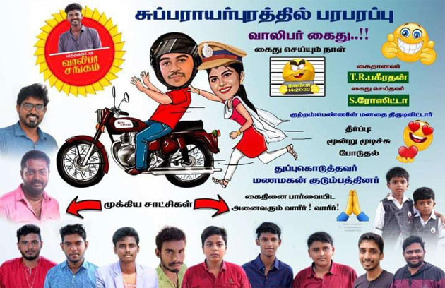 தூத்துக்குடி மாவட்டம் சாத்தான்குளம் அருகே உள்ள சுப்பராயபுரம் கிராமத்தை சேர்ந்த பகீரதன் - ரோஸிட்டா தம்பதியினருக்கு திருமண விழாவை முன்னிட்டு, அந்தப் பகுதியை சேர்ந்த இளைஞர்கள் சார்பில் திருமண விழாவிற்கு வைத்த பேனர் சமூக வலைதளத்தில் வைரலாக பரவி வருகிறது. அதன்படி அந்த பேனரில் செய்தி நாளிதழில் வரும் செய்தி தலைப்புகள் போல "சுப்பராயபுரத்தில் பரபரப்பு - வாலிபர் கைது" என்ற தலைப்பில் வினோதமான முறையில் பேனர் வைக்கப்பட்டுள்ளது.