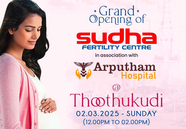 தூத்துக்குடி அற்புதம் மல்டி ஸ்பெஷாலிட்டி மருத்துவமனையில் சுதா கருத்தரிப்பு மையம் துவக்க விழாவை முன்னிட்டு குழந்தையின்மை மகளிர் நலம் மற்றும் கர்ப்பப்பை சிகிச்சைகளுக்கான இலவச மருத்துவ ஆலோசனைகளை மார்ச் 2ம் தேதி வழங்குகிறது.