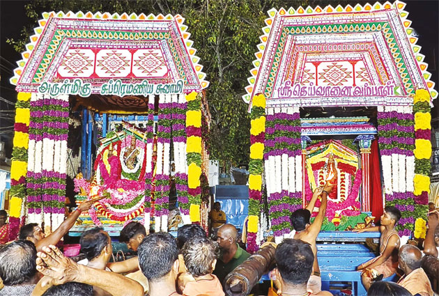 பின்னர் அங்கு மாலையில் சுவாமிக்கும், அம்பாளுக்கு அபிஷேகம் அலங்காரமாகி தீபாராதனை நடந்தது. தொடர்ந்து இரவு 7.45 மணிக்கு சுவாமி குமரவிடங்க பெருமான் சிங்ககேடய சப்பரத்திலும், தெய்வானை அம்பாள் பெரிய கேடய சப்பரத்திலும் எழுந்தருளி பரிவார மூர்த்திகளுடன் எட்டு வீதிகளிலும் உலா வந்து பக்தர்களுக்கு காட்சி கொடுத்து சிவன் கோவில் சேர்ந்தார்கள்.