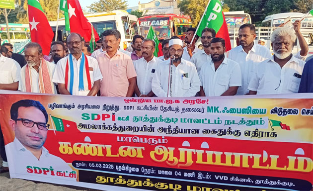 மத்திய பாஜக அரசின் அரசியல் பழிவாங்கும் நடவடிக்கையாக, பொய்யான குற்றச்சாட்டின் கீழ், அமலாக்கத்துறையால் எஸ்டிபிஐ கட்சியின் அகில இந்திய தலைவர் எம்.கே./பைஸி கைது செய்யப்பட்டுள்ளதை கண்டித்தும், அவரை விடுதலை செய்ய வலியுறுத்தியும் தூத்துக்குடி விவிடி சிக்னல் அருகே மாபெரும் கண்டன ஆர்ப்பாட்டம் நடைபெற்றது.