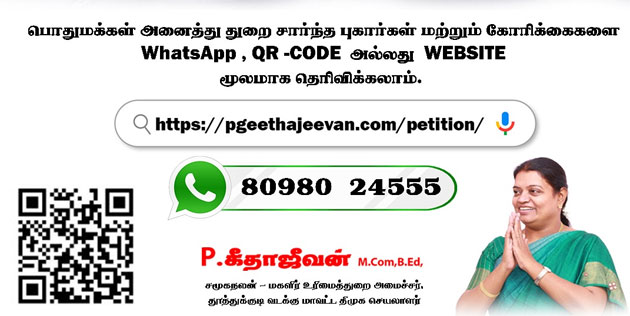 இது தொடர்பாக சமூக நலன் மற்றும் மகளிர் உரிமைத்துறை அமைச்சர், தூத்துக்குடி வடக்கு மாவட்ட செயலாளர் பி. கீதா ஜீவன் வெளியிட்ட செய்திக்குறிப்பில், "தொகுதியில் அனைத்து துறைகளிலும் உள்ள குறைகளையும் புகார்களையும் மேற்கண்ட QR-CODE அல்லது வாட்ஸ்ஆப் எண்(80980 24555) மூலமாகவோ அல்லது தொலைபேசி எண்(80980 24555) மூலமாகவோ இங்கே கொடுக்கப்பட்டுள்ள வெப்சைட் (https://pgeethajeevan.com/petition/?lang=ta) மூலமாகவோ அமைச்சர் கீதா ஜீவனிம் நேரடியாக தெரிவிக்கலாம். தங்கள் புகார்களுக்கு குறுகிய காலத்தில் உரிய நடவடிக்கை எடுக்கப்படும் என்று அறிவிக்கப்பட்டுள்ளது.