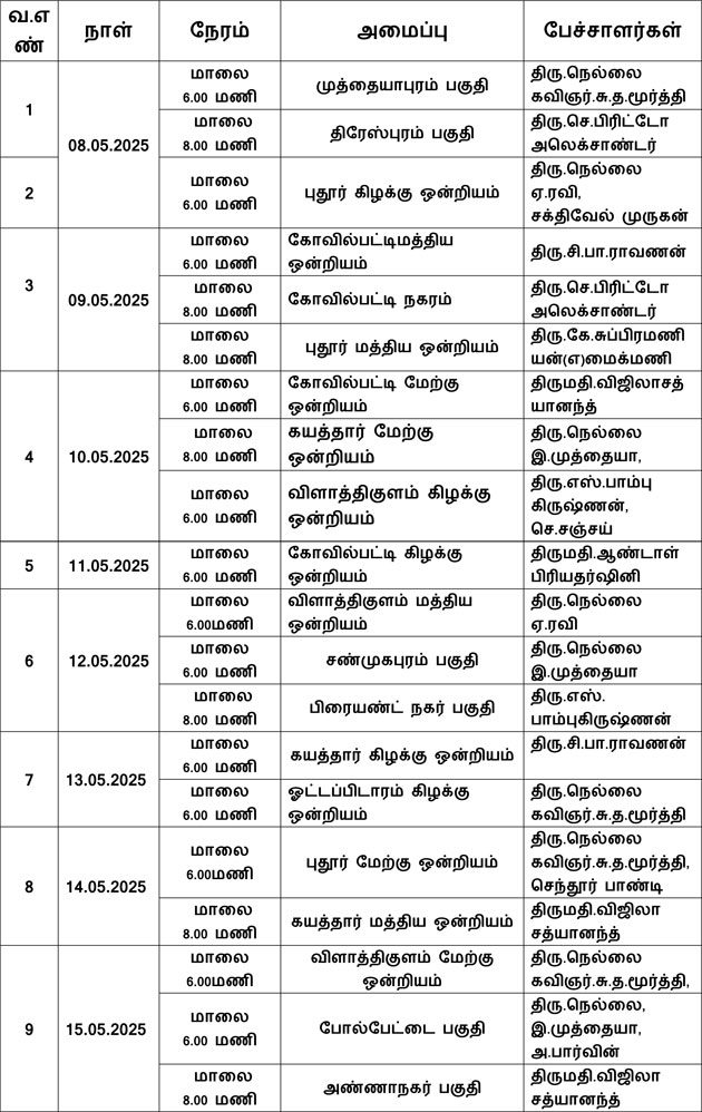 தூத்துக்குடி வடக்கு மாவட்டம் தி.மு.க சார்பில் "நாடு போற்றும் நான்காண்டு - தொடரட்டும் பல்லாண்டு" சாதனை விளக்கப் பொதுக்கூட்டங்கள் நடைபெற உள்ளது.