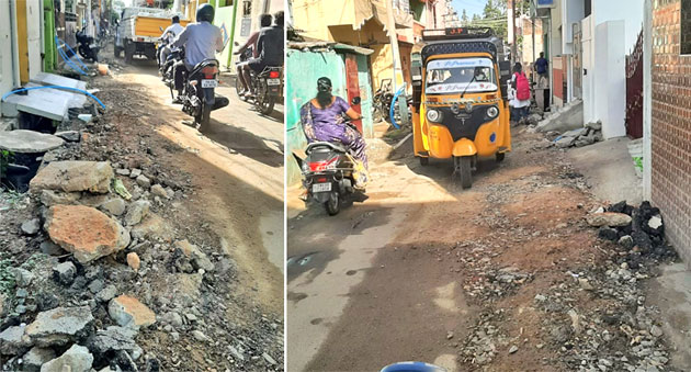 இதில் பகல் நேரத்தில் நடந்து செல்பவர்கள் கூட பலர் தடுமாறி கீழே விழுந்துள்ளனர். காலை, மற்றும் மாலை வேளைகளில் குழந்தைகளை பள்ளிக்கு அழைத்துச் செல்பவர்கள், ஆட்டோ மற்றும் இருசக்கர வாகனங்களில் செல்வோர் விபத்தில் சிக்க நேரிடுகிறது. எனவே மாநகராட்சி அதிகாரிகள் சம்பவ இடத்திற்கு சென்று குழிகளை சமன் செய்து, மீதமுள்ள தார் சாலை கழிவுகளை அப்புறப்படுத்த வேண்டும் என்று அப்பகுதி மக்கள் கோரிக்கை விடுத்துள்ளனர்.