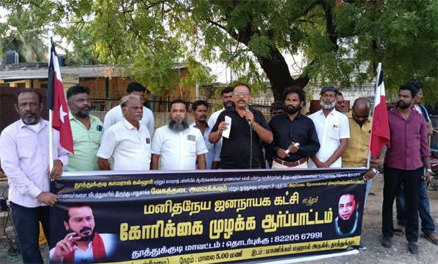 தூத்துக்குடி காமராஜ் கல்லூரி மற்றும் அதன் அருகில் இருக்கும் பள்ளியில் ஆயிரக்கணக்கான மாணவ, மாணவியர்கள் கல்வி பயின்று வருகிறார்கள். கல்லூரி முன்புள்ள சாலை ஆயிரக்கணக்கான வாகனங்களும், பொதுமக்களும் பயன்படுத்தக்கூடிய பிரதான சாலையாக இருக்கிறது. எனவே, அப்பகுதியில் விபத்துக்களை தடுக்க கல்லூரி முன்பு வேகத்தடை அமைக்க வலியுறுத்தி மனிதநேய ஜனநாயக கட்சி சார்பாக ஆர்ப்பாட்டம் நடைபெற்றது.