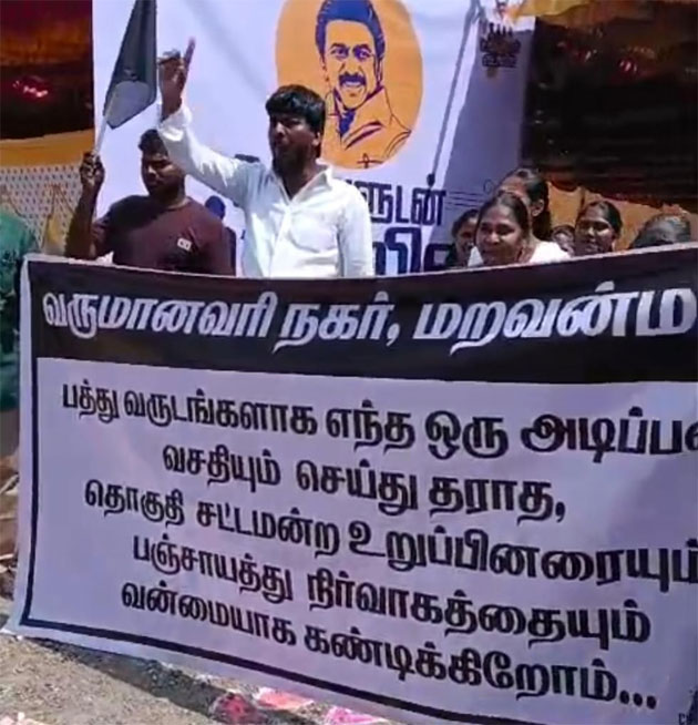 தூத்துக்குடியில் மறவன்மடம் கிராமத்தில் சாலை அமைக்க வலியுறத்தி கருப்பு கொடியுடன் பொதுமக்கள் திடீர் மறியல் போராட்டம் நடத்தினர். இதுகுறித்து அவர்கள் கூறுகையில், "மறவன்மடம் ஊராட்சியில் உள்ள வருமானவரி நகரில் 150க்கும் மேற்ப்பட்ட மக்கள் வசிக்கிறோம். கடந்த 10 ஆண்டுகளாக சாலை வசதி வேண்டி பஞ்சாயத்து நிர்வாகத்திடம் முறையிட்டும் மனு கொடுத்தும் வந்தோம்.