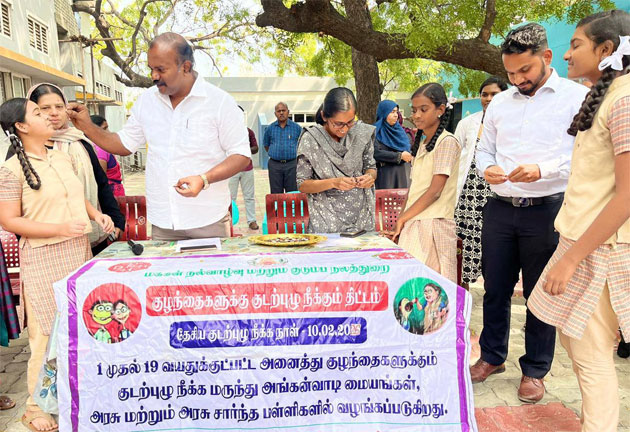 தேசிய குடற்புழு நீக்க நாளை முன்னிட்டு, தூத்துக்குடி ஜின் பாக்டரி சாலையில் உள்ள மாநகராட்சிப் பள்ளியில் குழந்தைகளுக்கு மாத்திரைகள் வழங்கும் நிகழ்ச்சி நடைபெற்றது. மாநகராட்சி மேயர் ஜெகன் பெரியசாமி, ஆணையர் சி. பிரியங்கா முன்னிலையில் மாத்திரை வழங்கும் திட்டத்தைத் தொடங்கி வைத்தார். இதில் கூடுதல் ஆட்சியர் புவனேஸ்ராம் மற்றும் மாநகராட்சி அதிகாரிகள் கலந்துகொண்டனர்.