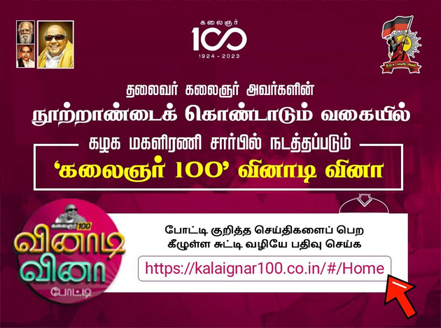 முத்தமிழறிஞர் கலைஞர் நூற்றாண்டை கொண்டாடும் வகையில் திமுக துணைப் பொதுச் செயலாளர் கனிமொழி கருணாநிதி எம்.பி அவர்களால் அண்ணா பிறந்தநாளில் கலைஞர் 100 வினாடி-வினா போட்டிகள் தொடங்கப்பட்டது. போட்டிகள் இணைய வழியில் தொடங்கப்பட்டு இன்று வரை 50,000 திற்கும் மேற்பட்ட குழுக்கள் பதிவு செய்யப்பட்டுள்ளன. மேலும், 1,24,097 மேற்பட்ட முயற்சிகளில் ஆர்வத்துடன் விளையாடி வருகின்றனர்.